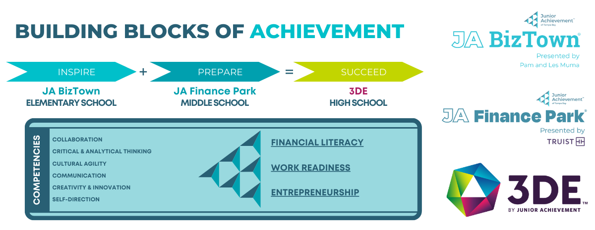 Junior Achievement of Tampa Bay offers three transformative learning experiences: JA BizTown presented by Pam & Les Muma, JA Finance Park presented by Truist, and 3DE by Junior Achievement, each designed to inspire, prepare, and ensure student success. In JA BizTown, students step into the shoes of adults, running a miniaturized city with diverse businesses, fostering financial literacy, and critical thinking. JA Finance Park empowers students with real-life financial scenarios, guiding them through budgeting, investing, and making informed choices for their future. With 3DE by Junior Achievement, students engage in immersive education models, experiencing boundless possibilities as they connect classroom knowledge to real-world challenges, sparking curiosity and igniting ambition. These invaluable programs have a profound impact on students, equipping them with practical skills, confidence, and a sense of purpose to excel in their personal and professional lives.